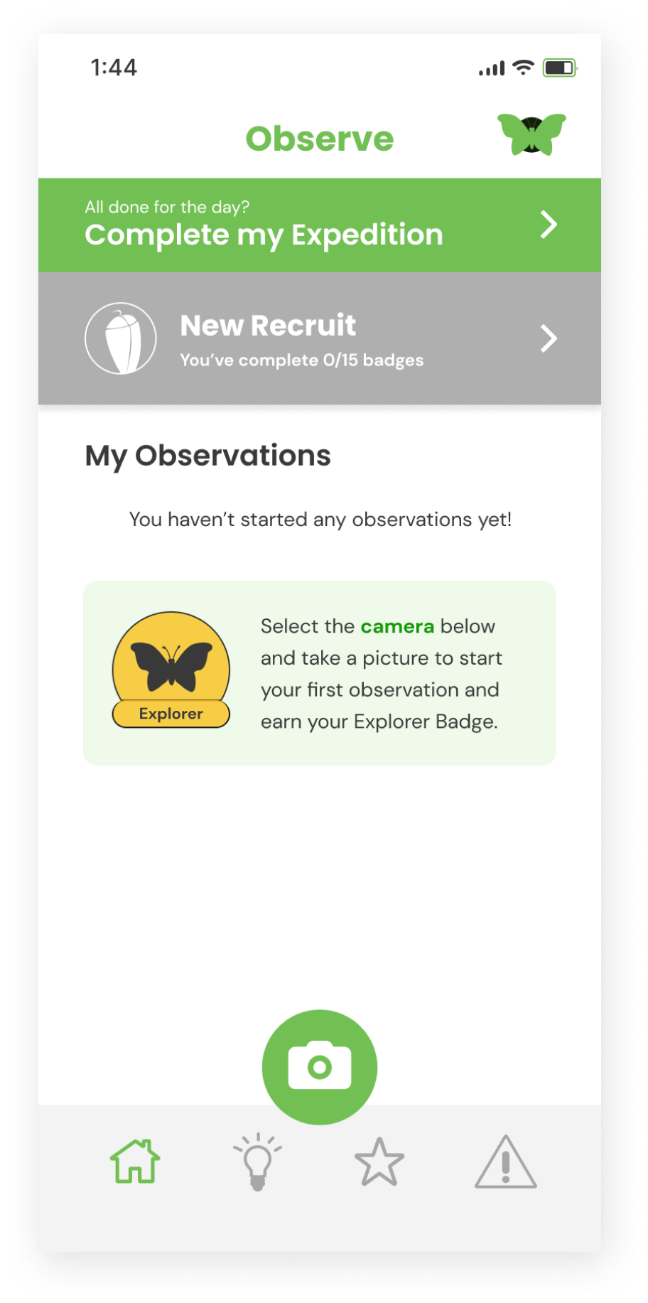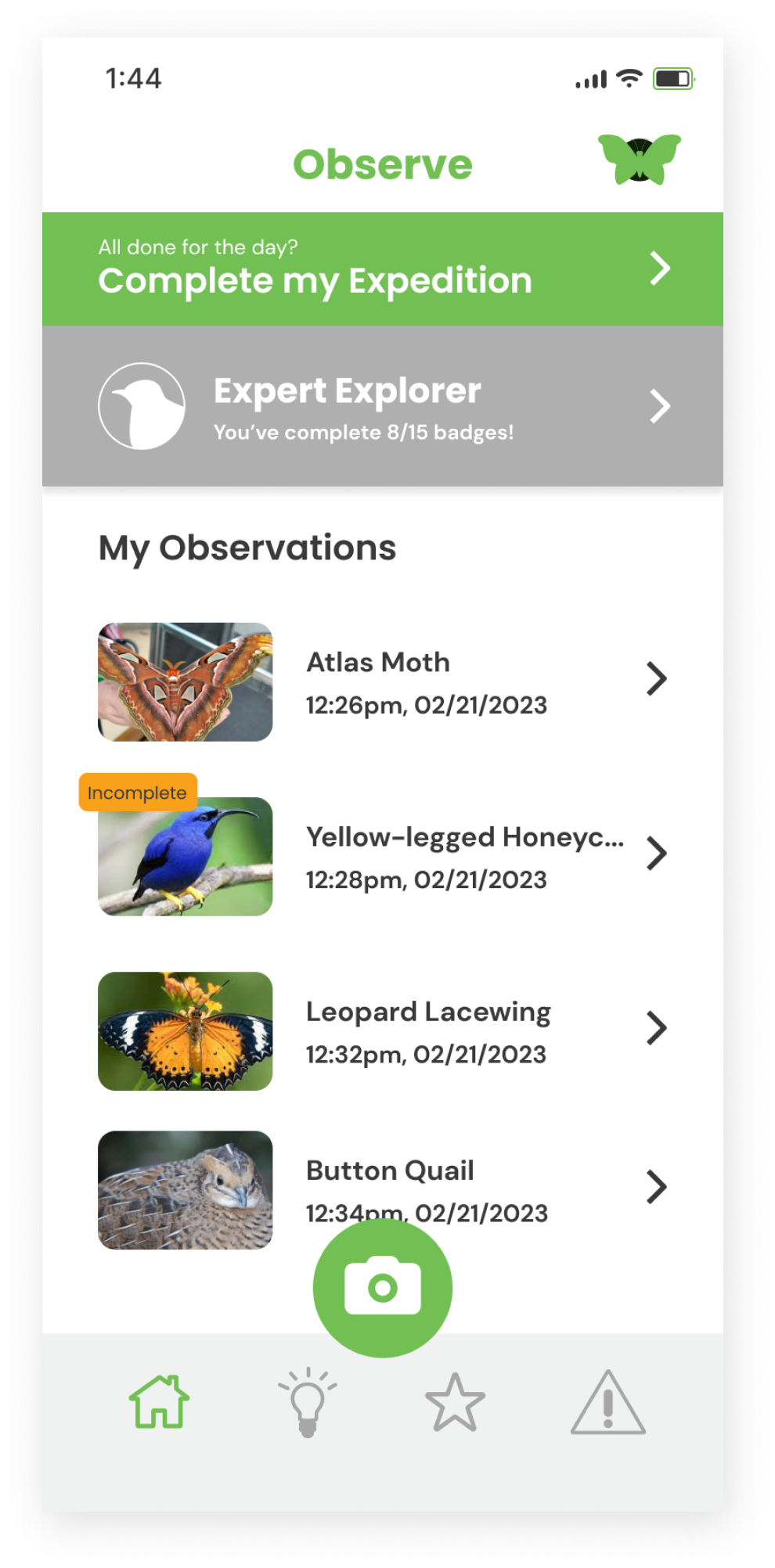 Observe and Discover, an identify-and-log set that allows users to ājoin the expeditionā by photographing, identifying, and gathering information about specific species in the Haven. This supported my goals for Moments of Discovery.