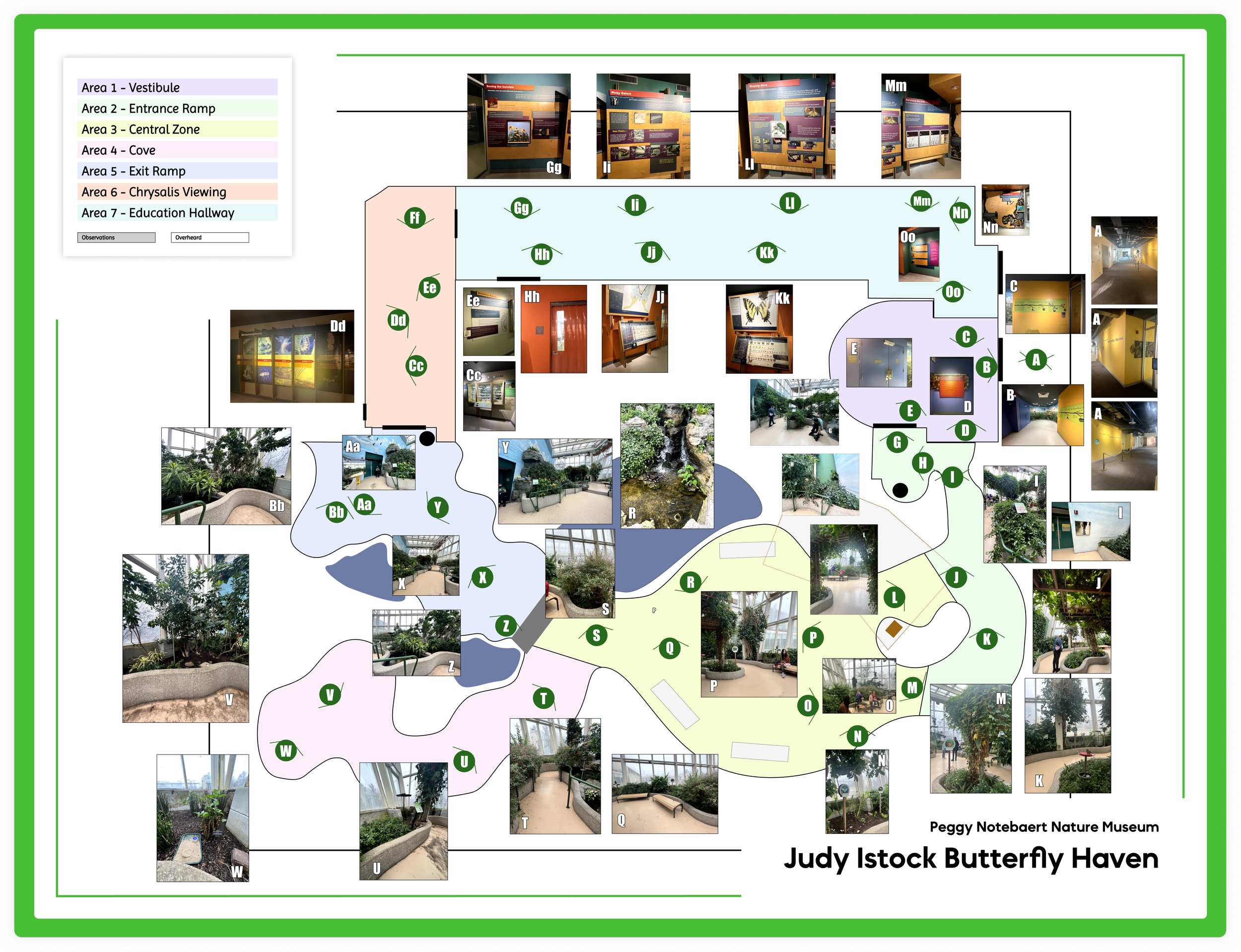 Prior to my observation sessions, I traveled to the Nature Museum to observe and photograph the layout and displays in and around the Butterfly Haven, establishing viewpoints and labeling each area in order to create, from scratch, my own digital map.
